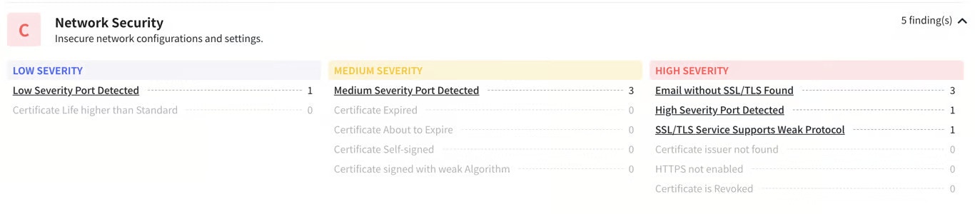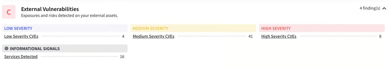 In this section we scan the publicly accessible services like your websites, external IPs or endpoints that can accessible via the public internet. Telivy parses your DNS and uses a network mapper to scan these endpoints to infer the existing vulnerabilities.The platform then classifies these vulnerabilities as a Low, Medium and High Severity vulnerabilities. Note that these classification are based on the NVE database maintained by the federal government.