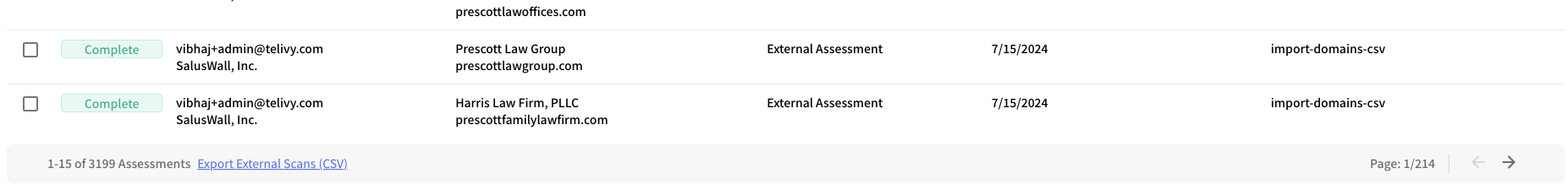- Once you upload the CSV, the external scans should be visible in your Telivy portal. All the scans should start immediately