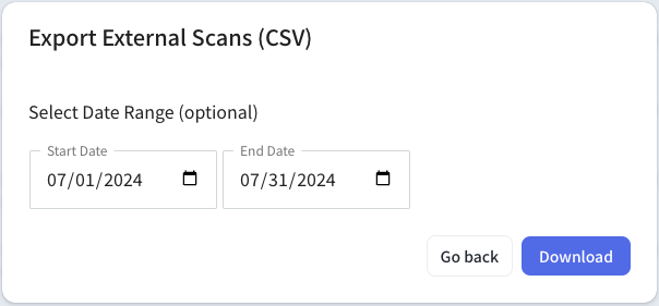 - In the next pop up you should be able to select the timeframes of the external scans that you would like to download in the CSV. If no such selection is made, the CSV will contain findings from all the external scans in your account.